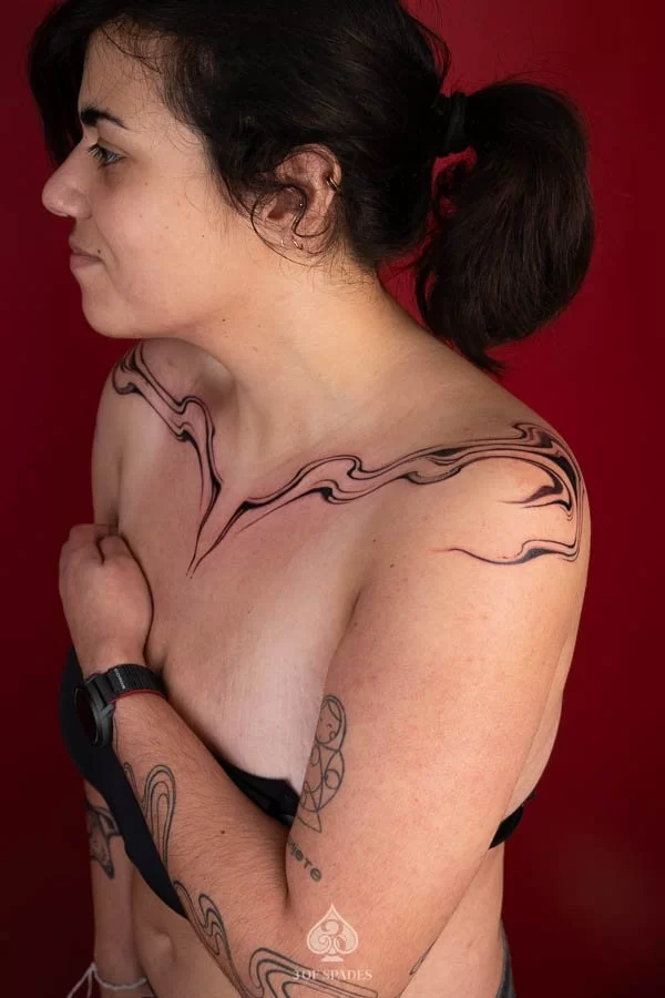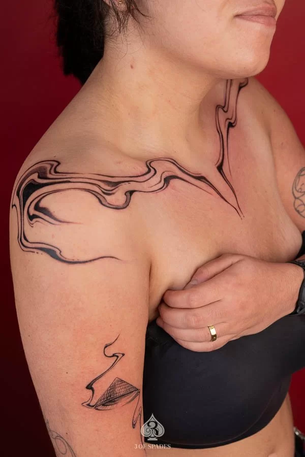 Most tattoos take 2 to 4 weeks for the surface to heal, with full skin recovery taking up to 3 months. We provide detailed aftercare instructions to ensure your Abstract Flow Conical Tattoo heals perfectly and retains its vibrancy.