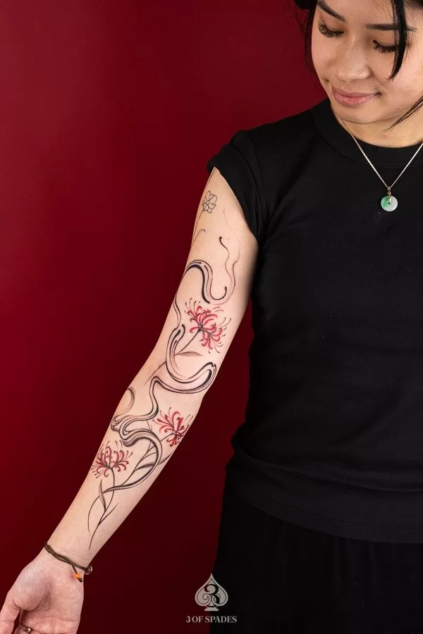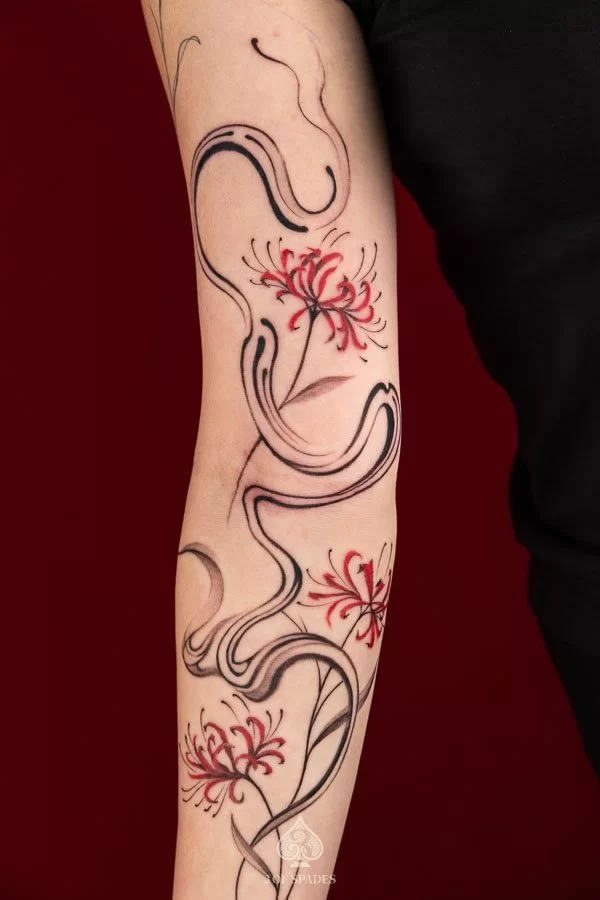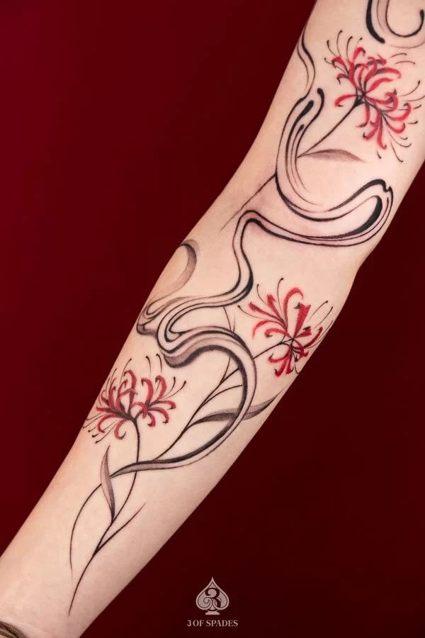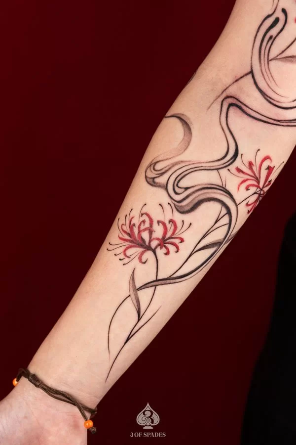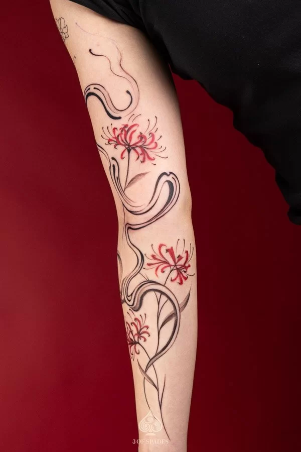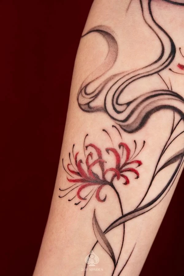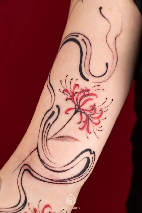 A Abstract Spider Lilly Flower tattoo holds cultural and spiritual meaning that transcends simple aesthetics. The specific meaning can vary based on the design elements, style, and personal intention of the wearer. Our artists at 3 Of Spades Tattoo Hanoi can help you incorporate meaningful details into your unique design.