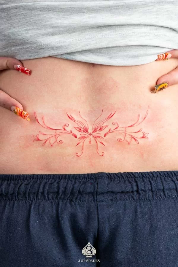 A Red Trampstamp tattoo symbolizes transformation, personal growth, and the courage to embrace change. The specific meaning can vary based on the design elements, style, and personal intention of the wearer. Our artists at 3 Of Spades Tattoo Hanoi can help you incorporate meaningful details into your unique design.