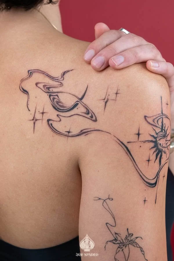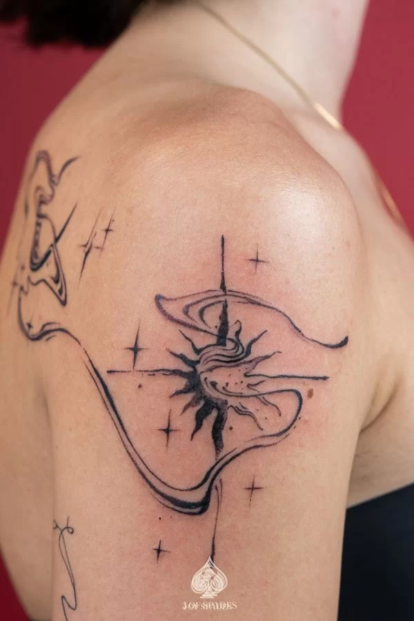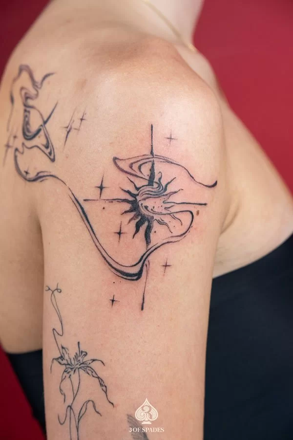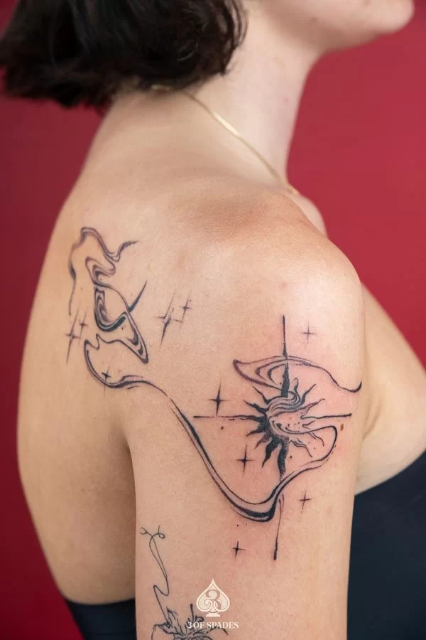A Sun And Moon Abstract Tattoo tattoo symbolizes transformation, personal growth, and the courage to embrace change. The specific meaning can vary based on the design elements, style, and personal intention of the wearer. Our artists at 3 Of Spades Tattoo Hanoi can help you incorporate meaningful details into your unique design.