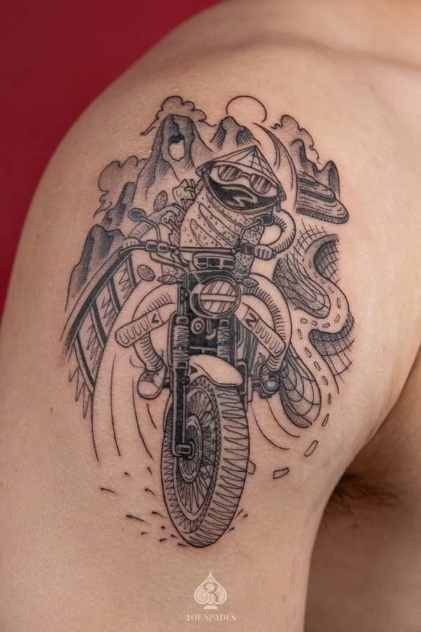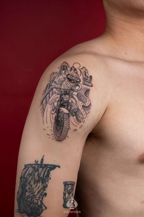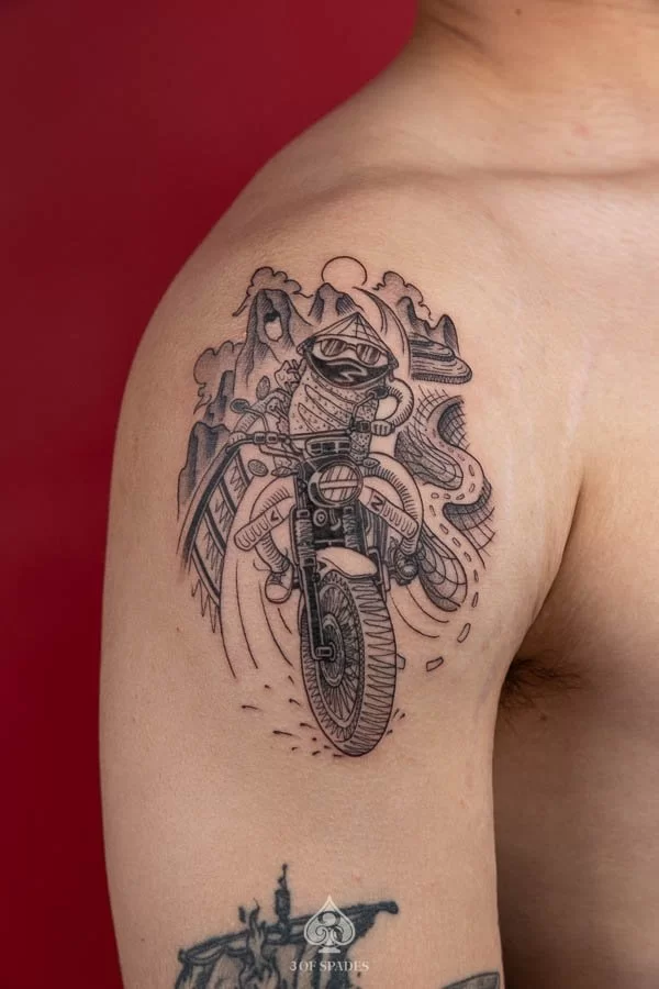 A Banhmy Racing tattoo embodies a story that words alone cannot capture. The specific meaning can vary based on the design elements, style, and personal intention of the wearer. Our artists at 3 Of Spades Tattoo Hanoi can help you incorporate meaningful details into your unique design.