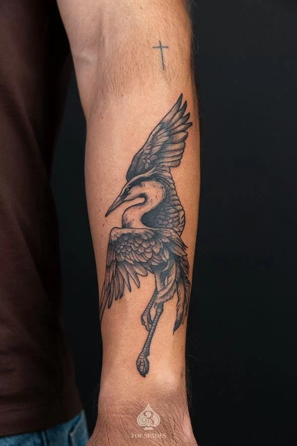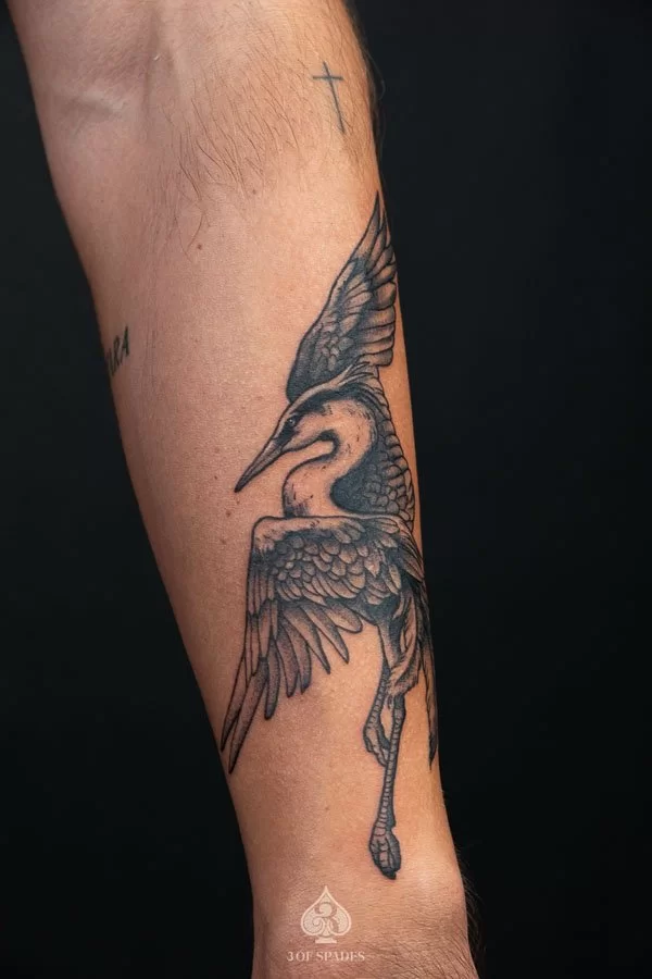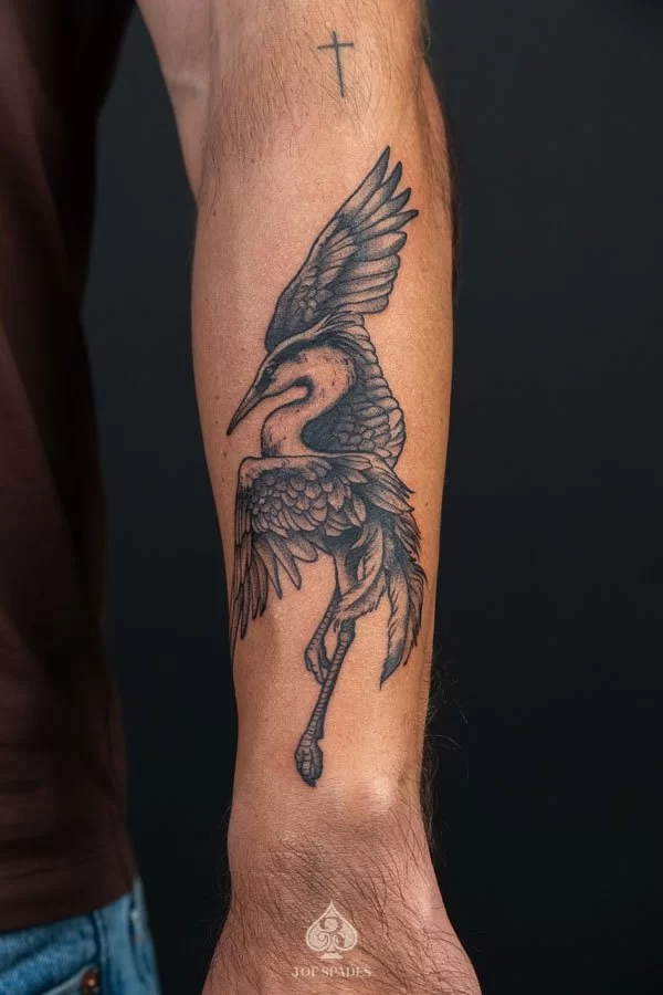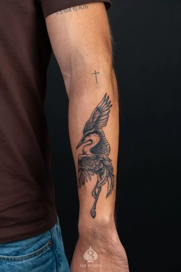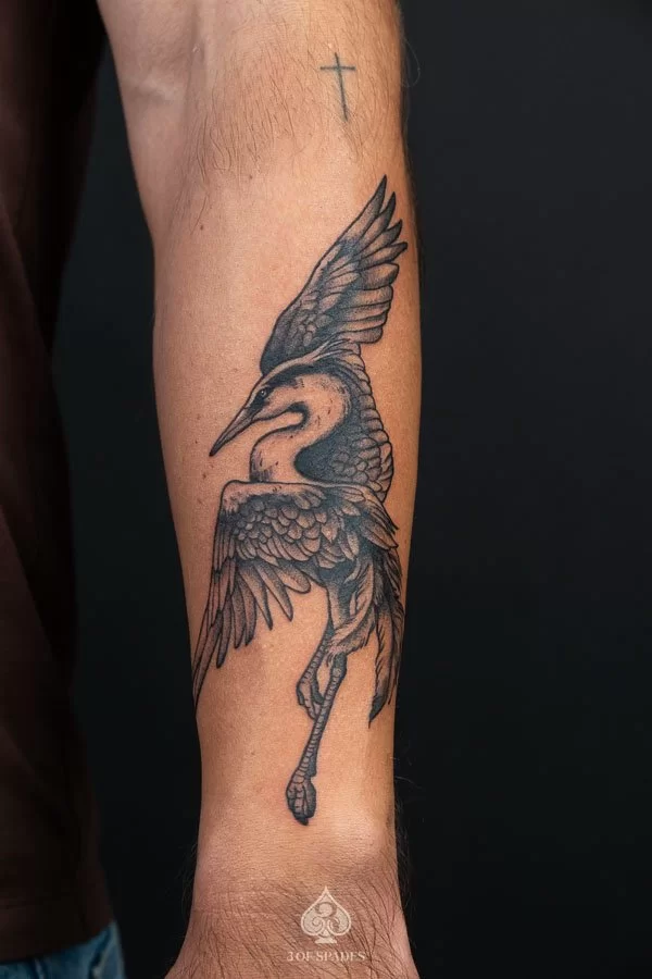This interpretation brings a painterly quality to the Crane Dancing Tattoo, blending artistic technique with tattoo craft. It creates a unique piece that feels both spontaneous and carefully considered.