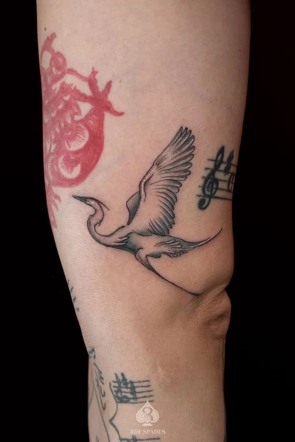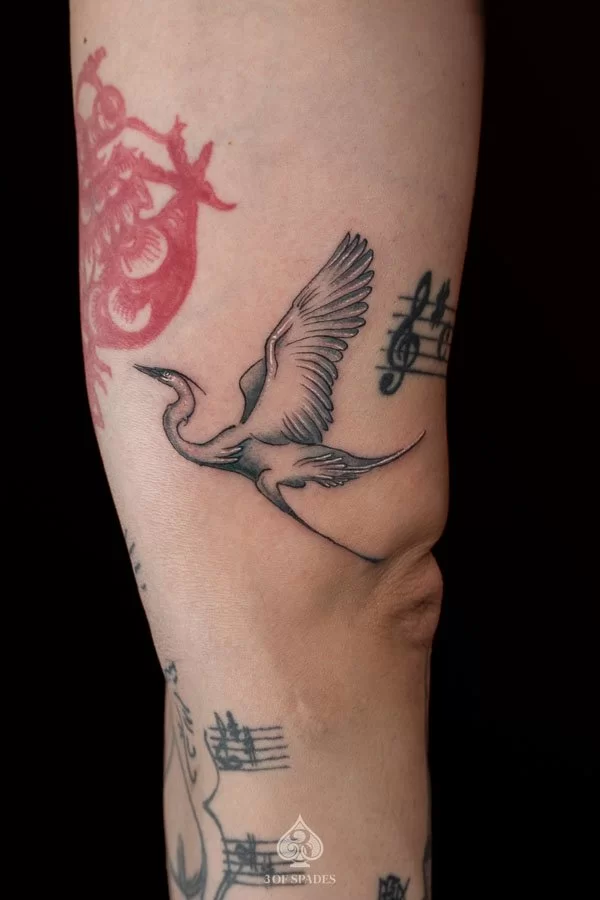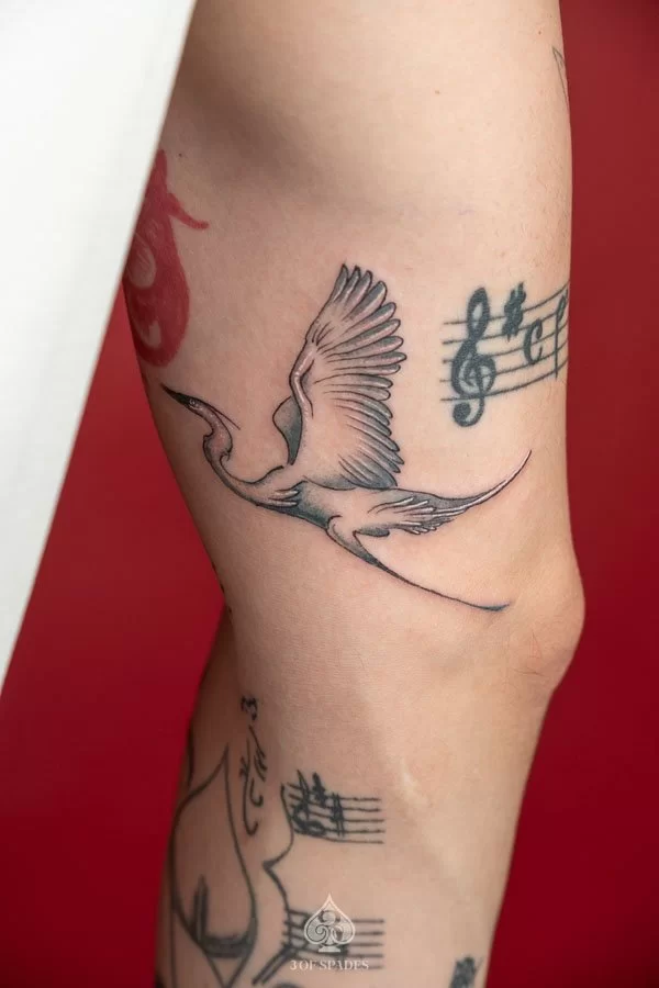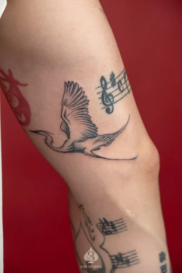 Most tattoos take 2 to 4 weeks for the surface to heal, with full skin recovery taking up to 3 months. We provide detailed aftercare instructions to ensure your Flying Crane 1 Tattoo heals perfectly and retains its vibrancy.