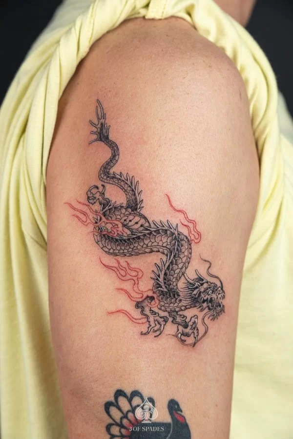 The Dragon With Red Cloud Tattoo is one of those designs that speaks before you do. At 3 Of Spades Tattoo Hanoi, we have had the privilege of bringing countless Dragon With Red Cloud designs to life for clients from around the world. Whether you discovered this design while traveling through Hanoi or have been dreaming about it for years, a Dragon With Red Cloud Tattoo at our studio is more than ink on skin. It is a statement, a memory, a piece of who you are. As we say: Body is my journal, tattoos are my stories.