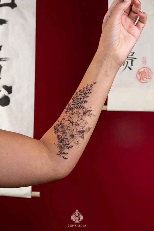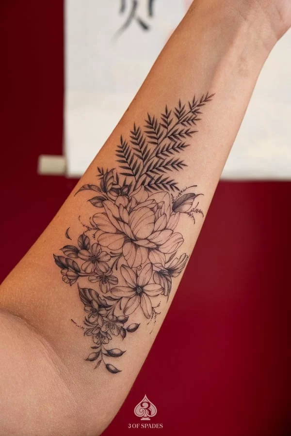 A Flower Fern Blackwork tattoo represents a powerful connection between inner emotion and outward expression. The specific meaning can vary based on the design elements, style, and personal intention of the wearer. Our artists at 3 Of Spades Tattoo Hanoi can help you incorporate meaningful details into your unique design.