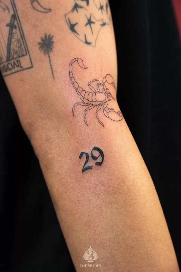 Most tattoos take 2 to 4 weeks for the surface to heal, with full skin recovery taking up to 3 months. We provide detailed aftercare instructions to ensure your Fineline Scorpion Tattoo heals perfectly and retains its vibrancy.