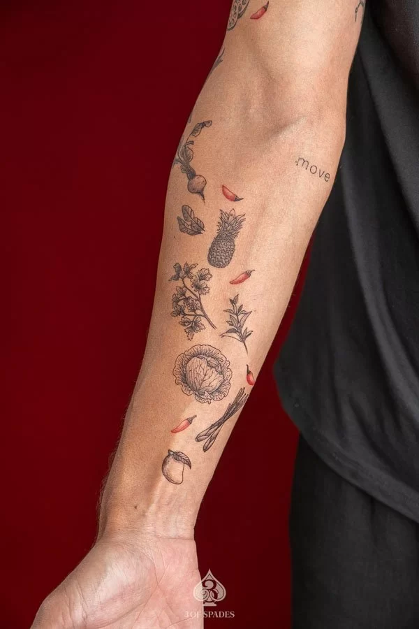 A Mini Food Ingredient tattoo holds cultural and spiritual meaning that transcends simple aesthetics. The specific meaning can vary based on the design elements, style, and personal intention of the wearer. Our artists at 3 Of Spades Tattoo Hanoi can help you incorporate meaningful details into your unique design.