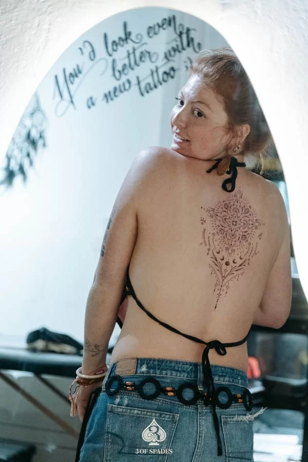Most tattoos take 2 to 4 weeks for the surface to heal, with full skin recovery taking up to 3 months. We provide detailed aftercare instructions to ensure your Ornament Back Tattoo Tattoo heals perfectly and retains its vibrancy.