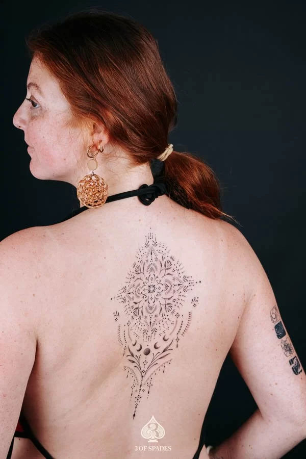 Taking the Ornament Back Tattoo design in a more detailed direction, this variation rewards close inspection. Every element is carefully rendered to create depth and dimension that makes the tattoo feel alive on the skin.