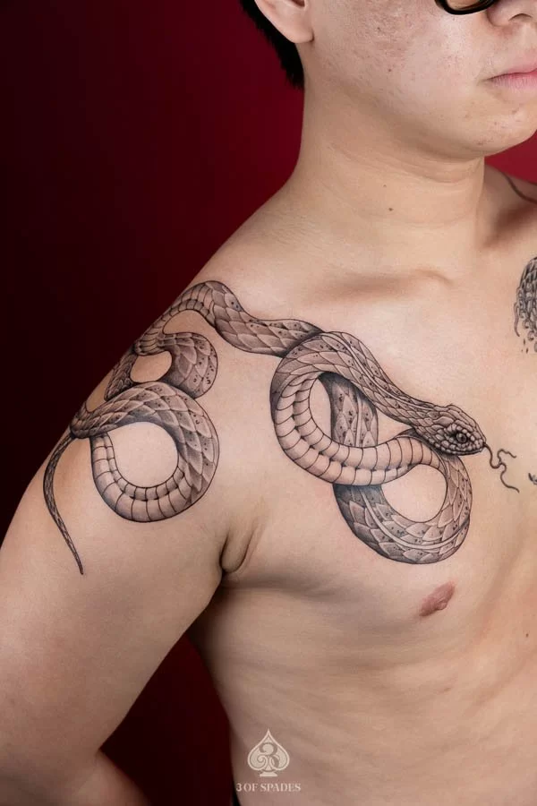 A Snake And Skeleton Snake tattoo carries deep personal significance for many who choose it. The specific meaning can vary based on the design elements, style, and personal intention of the wearer. Our artists at 3 Of Spades Tattoo Hanoi can help you incorporate meaningful details into your unique design.