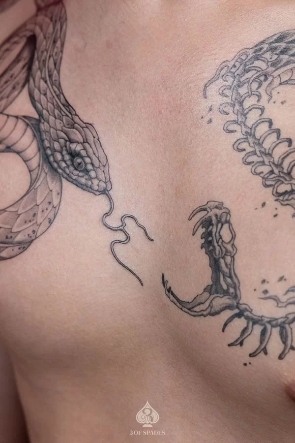 Most tattoos take 2 to 4 weeks for the surface to heal, with full skin recovery taking up to 3 months. We provide detailed aftercare instructions to ensure your Snake And Skeleton Snake Tattoo heals perfectly and retains its vibrancy.
