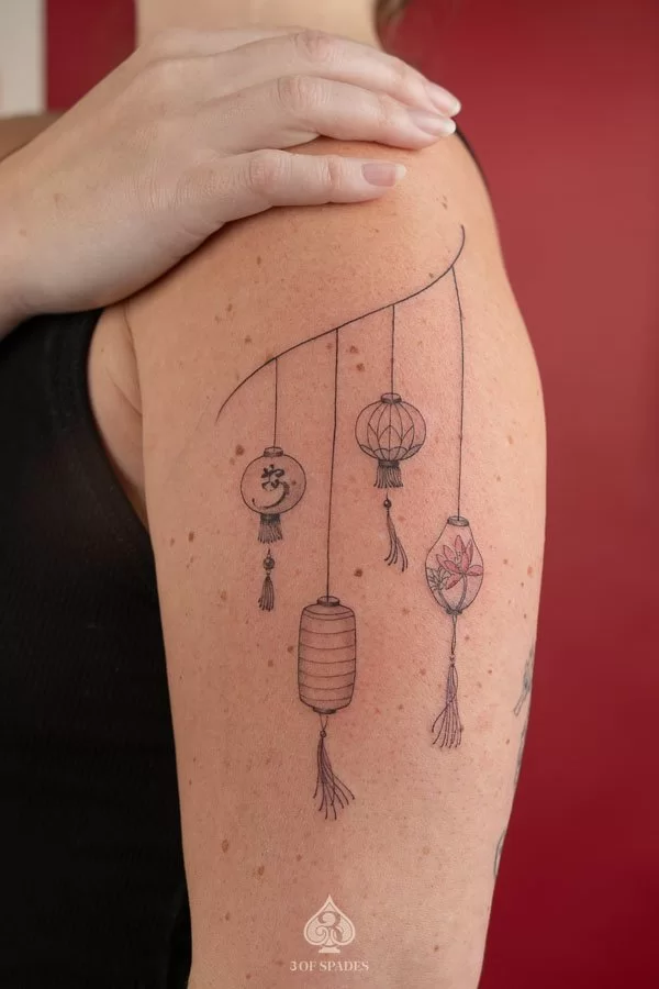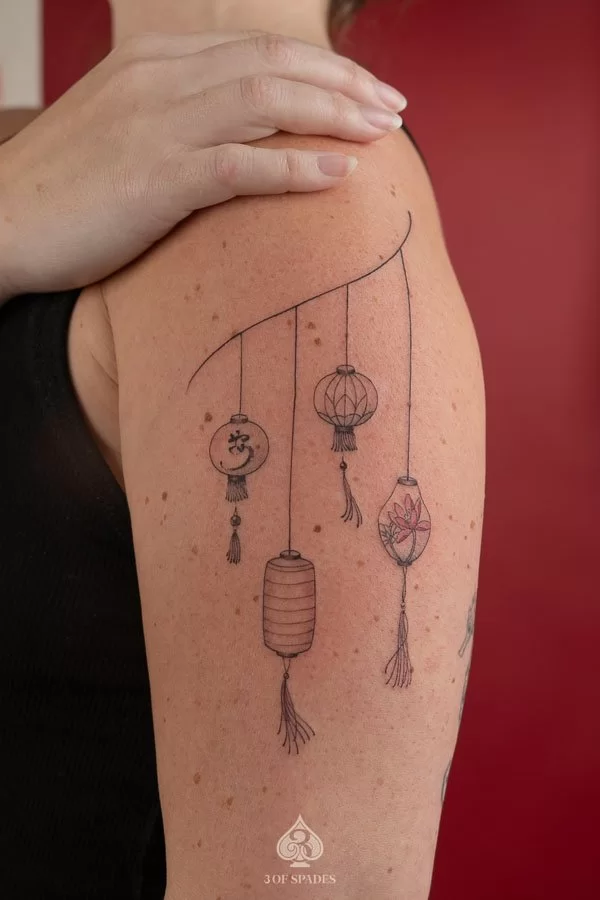 A Fineline Stamps And Lantern Tattoo 2 tattoo holds cultural and spiritual meaning that transcends simple aesthetics. The specific meaning can vary based on the design elements, style, and personal intention of the wearer. Our artists at 3 Of Spades Tattoo Hanoi can help you incorporate meaningful details into your unique design.
