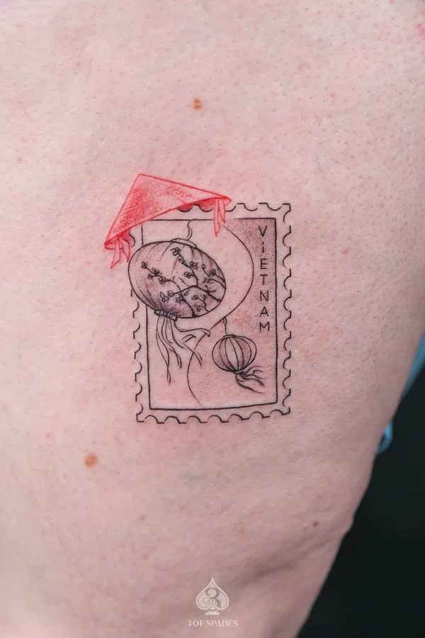 A Red Conical Hat Stamp tattoo carries deep personal significance for many who choose it. The specific meaning can vary based on the design elements, style, and personal intention of the wearer. Our artists at 3 Of Spades Tattoo Hanoi can help you incorporate meaningful details into your unique design.