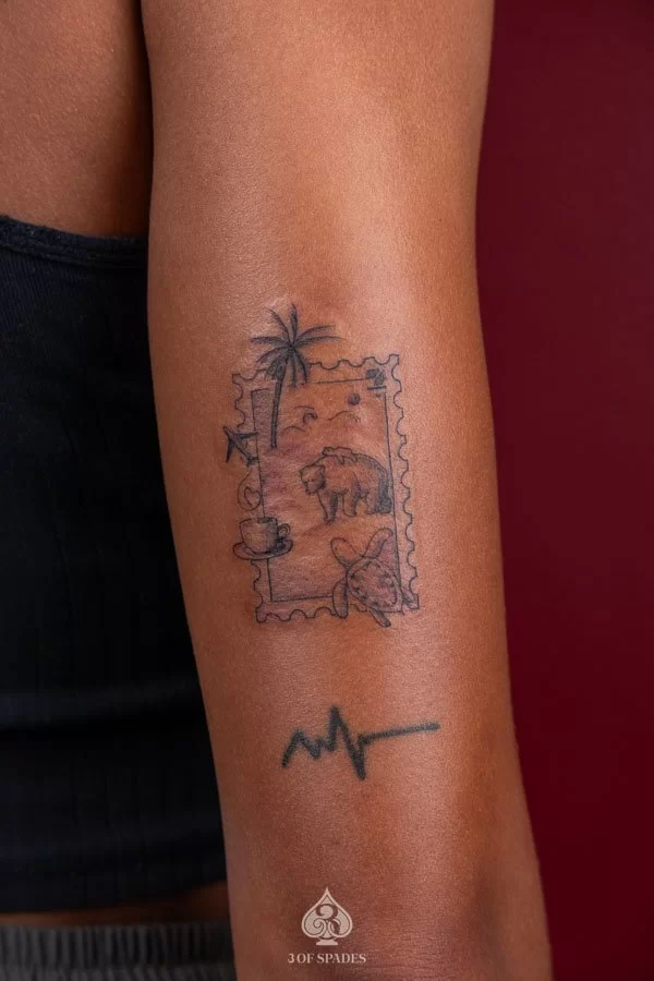 Most tattoos take 2 to 4 weeks for the surface to heal, with full skin recovery taking up to 3 months. We provide detailed aftercare instructions to ensure your Stamps Travel Tattoo heals perfectly and retains its vibrancy.