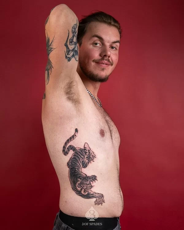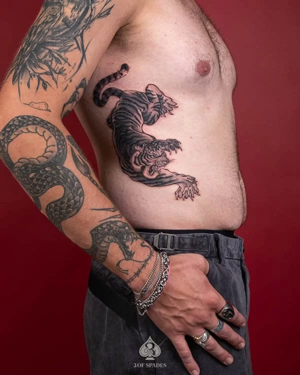 Most tattoos take 2 to 4 weeks for the surface to heal, with full skin recovery taking up to 3 months. We provide detailed aftercare instructions to ensure your Tiger Blackwork Ribb Tattoo heals perfectly and retains its vibrancy.