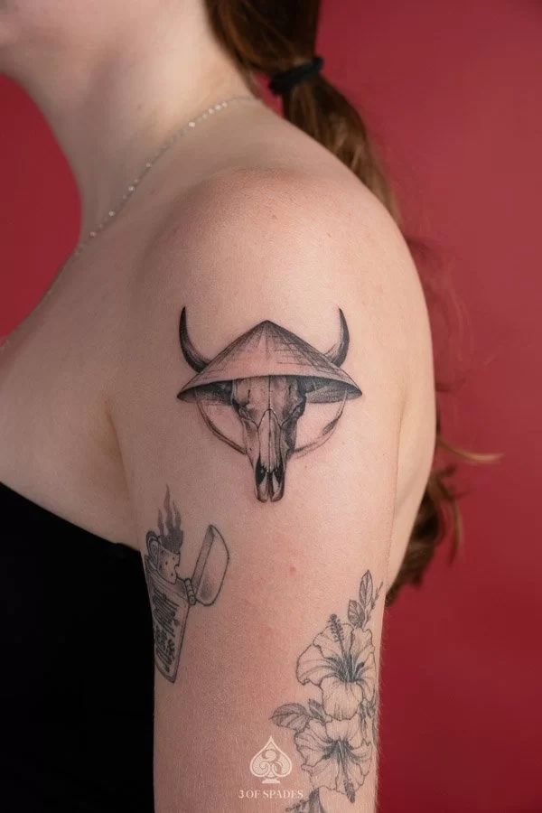 Absolutely. At 3 Of Spades Tattoo Hanoi, every tattoo starts as a custom design. We do not use generic flash art unless specifically requested. Your Buffalo Conical Hat tattoo will be a one-of-a-kind piece created specifically for you.