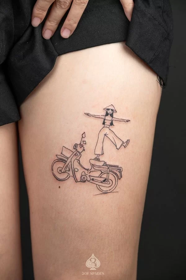 Your Dancing Girrl Bike Tattoo journey starts with a conversation. Whether you have a clear vision or just the beginning of an idea, our artists at 3 Of Spades Tattoo Hanoi are ready to collaborate with you. We believe that Body is my journal, tattoos are my stories, and we are here to help you write your next chapter.