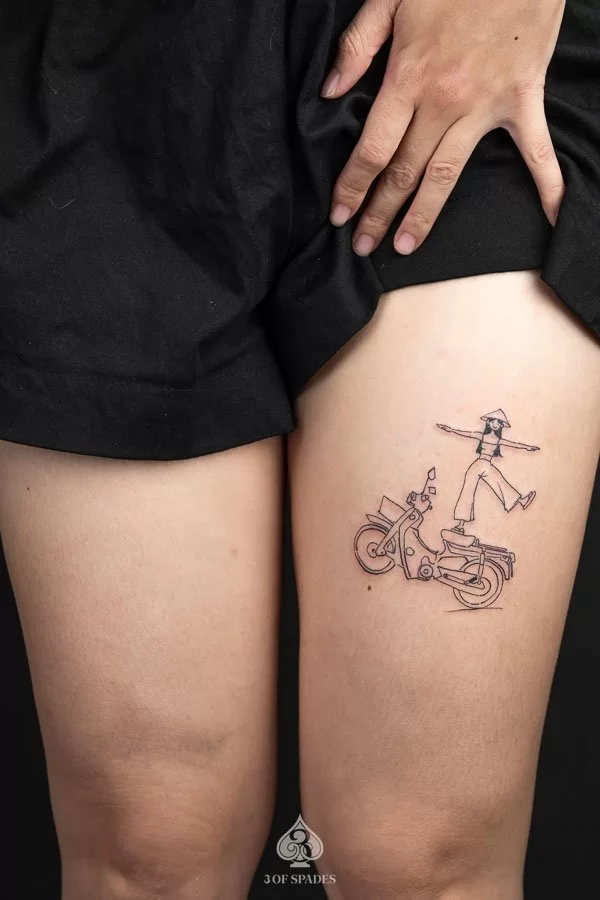 A Dancing Girrl Bike tattoo embodies a story that words alone cannot capture. The specific meaning can vary based on the design elements, style, and personal intention of the wearer. Our artists at 3 Of Spades Tattoo Hanoi can help you incorporate meaningful details into your unique design.