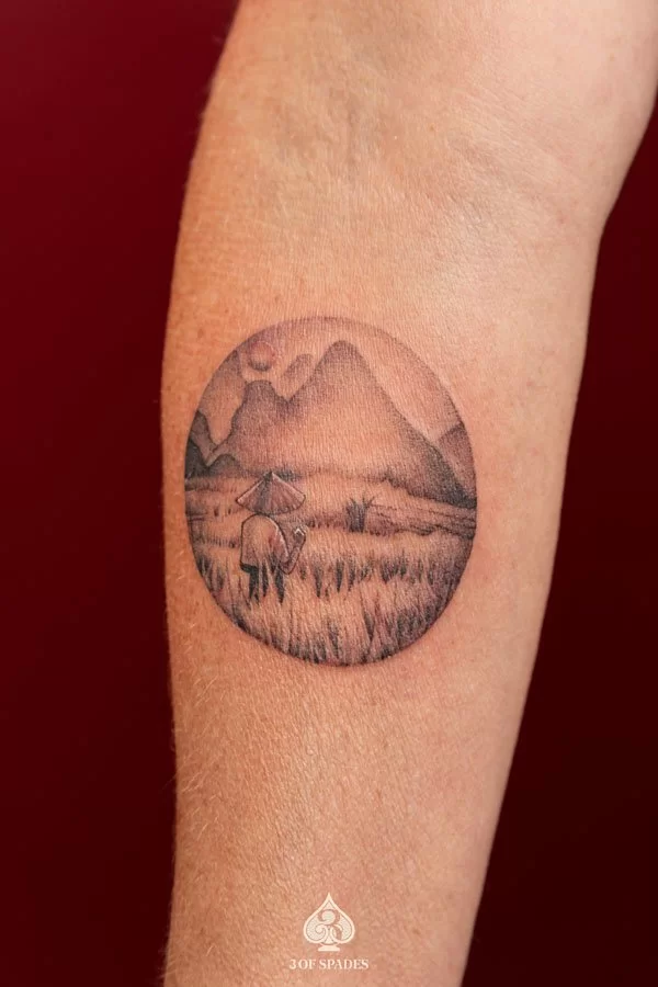 A Vietnam Rice Field tattoo represents a powerful connection between inner emotion and outward expression. The specific meaning can vary based on the design elements, style, and personal intention of the wearer. Our artists at 3 Of Spades Tattoo Hanoi can help you incorporate meaningful details into your unique design.