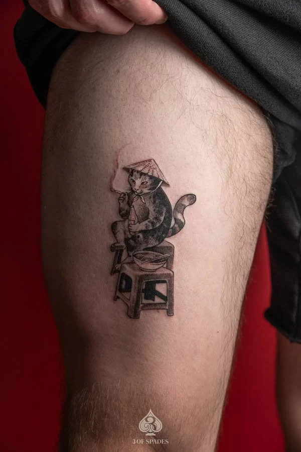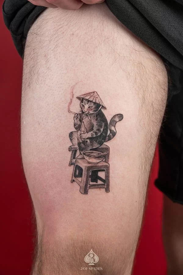 A Vietnamese Cat Smoking tattoo embodies a story that words alone cannot capture. The specific meaning can vary based on the design elements, style, and personal intention of the wearer. Our artists at 3 Of Spades Tattoo Hanoi can help you incorporate meaningful details into your unique design.